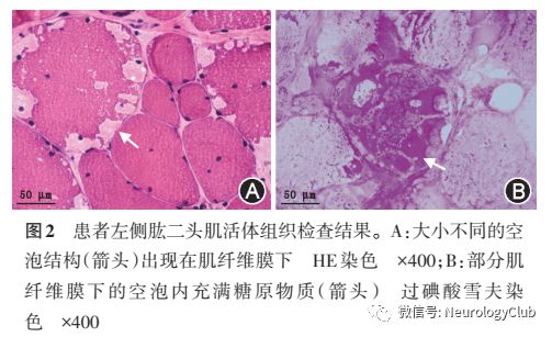 李颖(首都医科大学附属北京安贞医院神经内科):患者左侧肱二头肌活检标本,在HE染色下可见肌束衣内结缔组织重度增生。肌纤维直径变异10-130μm,I型和II型肌纤维呈棋盘格样分布,两型肌纤维的直径差异不大。部分肌纤维膜下可见直径5-30μm的不规则空泡,过碘酸雪夫(PAS)染色显示部分空泡糖原深染(图2)。空泡主要出现在I型肌纤维,不具有氧化酶活性,在非特异性酯酶染色略深染。可见少数分叶状肌纤维,偶见坏死、再生肌纤维和分裂改变肌纤维,部分肌纤维出现核内移,偶见核聚集现象。没有看到炎性细胞浸润,也没有发现中央核肌病、中央轴空病和杆状体肌病的典型病理改变。未见典型不整红边纤维以及细胞色素C氧化酶阴性肌纤维。免疫组织化学染色显示抗肌萎缩蛋白、肌聚糖蛋白、结蛋白肌纤维膜均匀阳性表达。