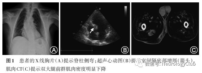 辅助检查:丙氨酸氨基转移酶35U/L(正常值9-60U/L)、天冬氨酸氨基转移酶125U/L(正常值15-45U/L)、总胆红素43.4μmol/L(正常值5-21μmol/L)、直接胆红素8.51μmol/L(正常值0.5-6.8μmol/L)、肌酐24.8mmol/L(正常值57-111mmol/L)、尿酸441.7μmol/L(正常值208-420μmol/L)、低密度脂蛋白胆固醇4.01mmol/L(正常值1.04-1.55mmol/L)、总胆固醇5.46mmol/L(正常值3.1-5.2mmol/L)。血清肌酸激酶862U/L(正常值38-174U/L),肌酸激酶同工酶37.6ng/ml(正常值0.6-6.3ng/ml)、血清肌红蛋白238.5ng/ml(正常值17.4-105ng/ml)。血、尿、便常规、血糖、糖化血红蛋白、甘油三酯、甲状腺功能、血气分析均无异常。胸片正位提示脊柱侧弯(图1A)。超声心动图提示房间隔中部菲薄,室间隔基底部肥厚约15mm(图1B)。腹部超声未见肝脾肿大。骨骼肌CT显示双侧臀部肌肉及大腿前群肌肉密度明显下降,左侧股二头肌较右侧重(图1C)。肌电图显示双正中神经运动传导速度及远端潜伏期正常,复合肌肉动作电位(CMAP)波幅降低;双侧尺神经、胫神经、腓神经运动传导速度、远端潜伏期以及CMAP波幅均正常,胸锁乳突肌、四肢多块肌肉、T11-10脊旁肌插入后均可见肌源性损害合并神经源性损害伴随大量肌强直放电(表1)。经患者本人知情同意后,行左侧肱二头肌活体组织检查(活检)及二代基因测序。