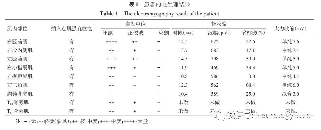 体格检查:身高165cm,体重65kg。脊柱侧凸、双足第三和四趾短趾畸形。眼球各方向活动充分。双侧咀嚼力弱,伴颞肌和咬肌萎缩。双侧转颈和耸肩肌力IV级,颈屈肌力IV级,双侧胸锁乳突肌无萎缩。四肢感觉无异常。双上肢近端肌力III级,远端肌力IV级。左下肢近端肌力II级,右下肢近端III级,双下肢远端肌力IV级,四肢肌张力低,双手肌肉萎缩,双下肢近端肌肉萎缩,叩击性肌强直阴性,无肌束震颤。腹壁反射存在,双肱三头肌腱反射、肱二头肌腱反射、双跟腱反射未引出,右侧膝腱反射较左侧略活跃,双侧足跖反射阳性。