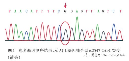 基因学检查:发现AGL基因20号外显子存在纯合型c.2547-2A>G剪切突变(图4)。其弟未携带,其女携带一个杂合c.2547-2A>G剪切突变。