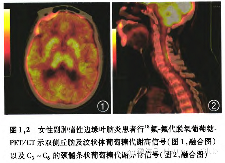 副肿瘤性LE常有边缘系统症状之外的体征,可表现为副肿瘤性脑脊髓炎。通常与小细胞肺癌相关。在副肿瘤综合征患者中有2/3在确诊肿瘤之前出现神经系统症状。所有的LE患者都应进行肿瘤筛查,首选氟代脱氧葡萄糖(FDG)-PET/CT扫描。笔者曾遇到数例副肿瘤性LE患者,其中1例女性65岁患者因“进行性双下肢麻木乏力半年,反应迟钝伴精神症状1个月”入院,脑部表现完全符合LE。其全身FDG-PET/CT扫描可见大脑(图1)、颈髓(图2)均显示副肿瘤性脑脊髓炎的高代谢表现,并发现肺癌病灶。张祥等的研究还发现抗N-甲基-D-天冬氨酸(NMDA)受体脑炎患者在疾病不同时期的脑18F-FDG PET/CT显像表现为18F-FDG由增高到减低的过程,可能累及部位主要有额颞枕顶叶皮质、基底节及小脑,以左侧大脑半球及右侧小脑为主,在实践中应注意观察这些特点影像。此外,对副肿瘤性LE也需要行颈胸腹的CT检查,男性尤其应该注意睾丸检查。副肿瘤性LE的确诊需要具备临床表现、边缘系统受累的形态学证据、抗体检测阳性及起病后5年内发现肿瘤等条件。