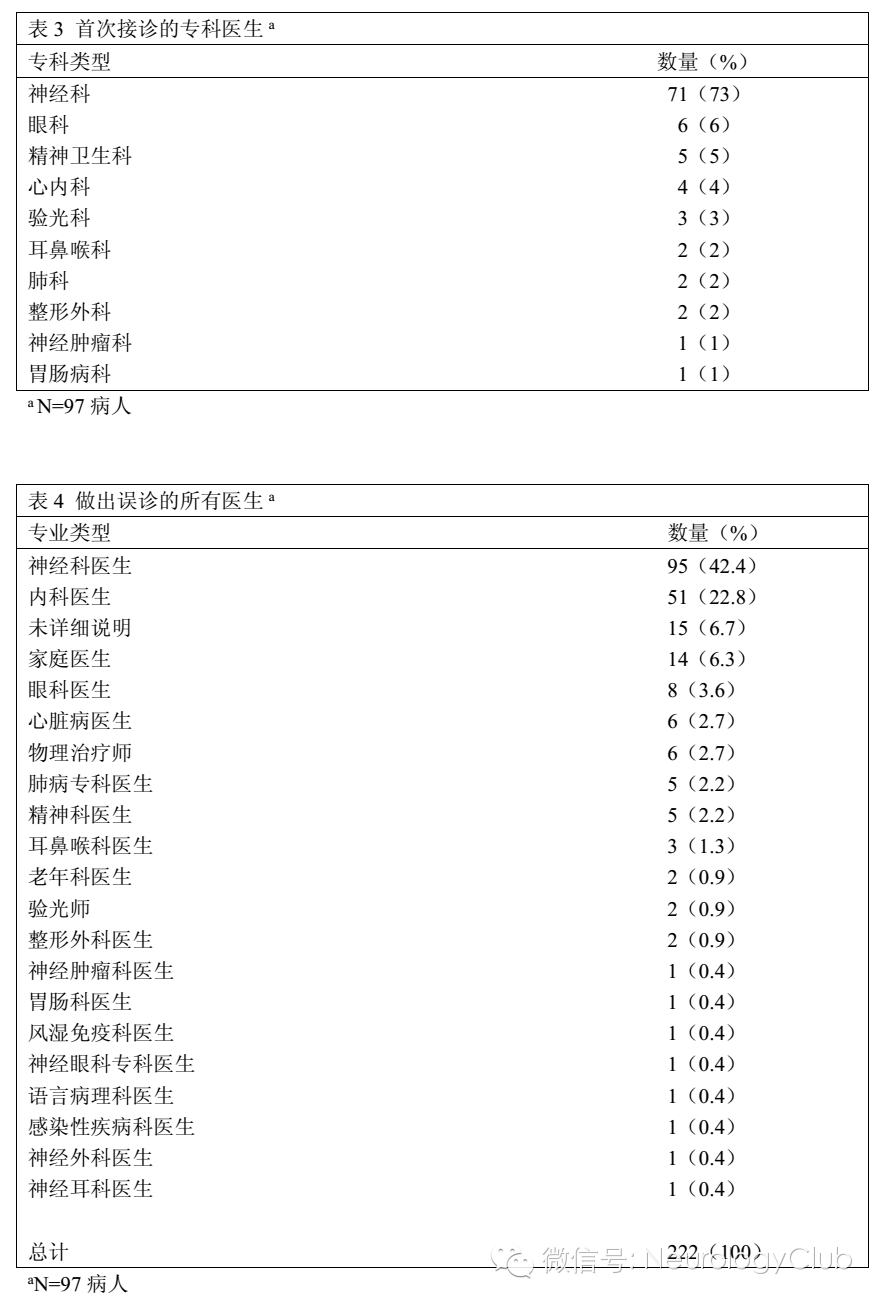 97位sCJD患者在诊断为可能的CJD之前总共收到了373个不同的诊断,平均每例3.8个误诊。下图显示了16种误诊的疾病类别及其出现的频率。神经退行性疾病,自身免疫性疾病,感染,中毒/代谢性疾病和不明原因的痴呆是sCJD患者最常见的误诊类别。表1为10种最常见的误诊疾病,表2为五种最常见的误诊疾病种类中最常见的诊断。75%的患者一开始由初级保健医生(40%)或神经科医生(36%)进行评估。多数患者最初就诊于他们的初级保健医生处,然后被转诊给神经科医生。只有25%的病人起初就诊于非神经科医生处。本研究中的97例患者最初就诊的专科医生中,有71例是神经科医生(见表3)。在患者诊断为可能的sCJD之前所就诊过的所有医生专科类别如表4所示;在给出误诊的所有医生中,神经科医生与内科医生占了绝大部分。17例(18%)患者在初次就诊时就得到了正确的诊断,其中16例就诊于神经科医生,还有1例就诊于康复科医生。表5显示了鉴别诊断中考虑到sCJD所需要的时间以及做出诊断可能CJD诊断所需要的时间。