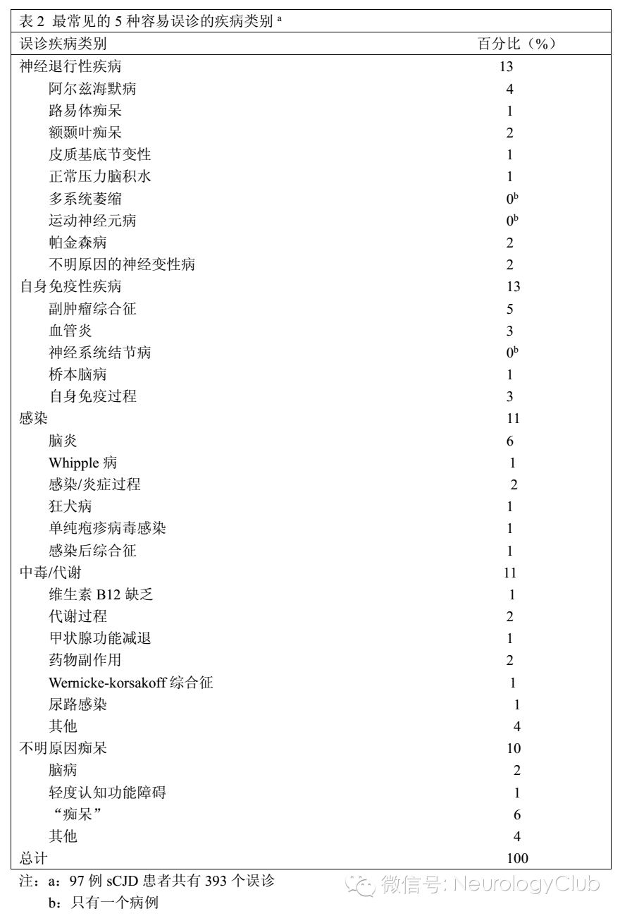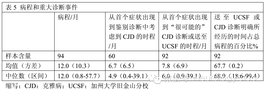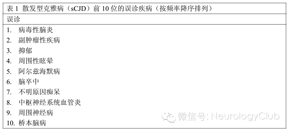 作为人类朊蛋白病主要转诊中心之一,我们已经注意到很多sCJD患者家属常抱怨sCJD诊断延误以及sCJD确诊前的各种误诊。这一现象促使我们进行回顾性研究来发现最常见的早期误诊,在病程中何时能下正确诊断以及明确何种专科最易做出误诊。加快sCJD的正确诊断可以避免潜在的感染控制问题和其他大量昂贵的评估,使患者家属把重点放在患者照料及临终关怀上,也有助于目前进行中或未来治疗试验的患者早期登记。