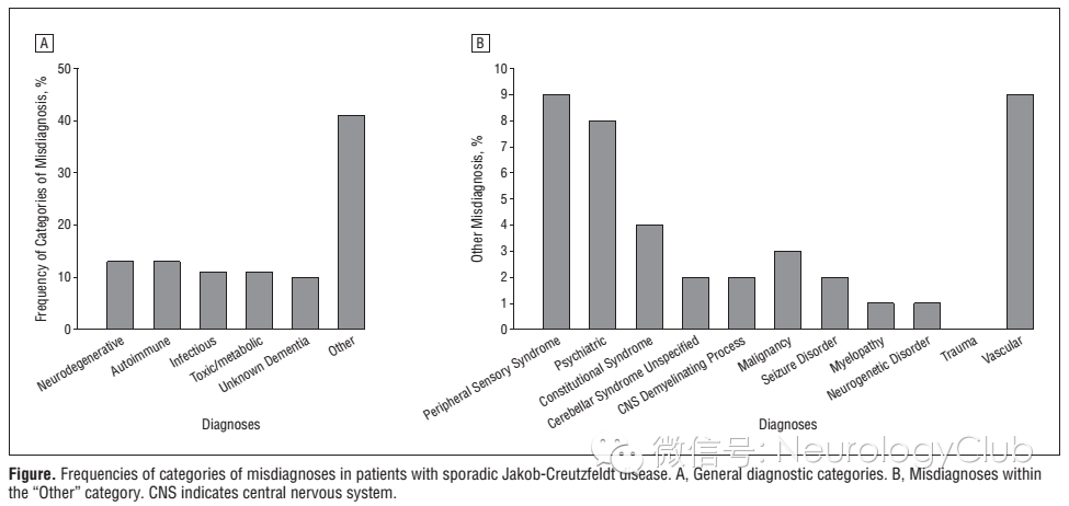 据我们所知,这是目前首次大规模的有病理学支持的回顾性sCJD临床研究,旨在探究可能误诊的疾病,谁做出的误诊和正确诊断所需时间。我们发现CJD很少为初次诊断,并且容易和许多疾病混淆。最常见的误诊疾病类别为神经系统退行性疾病、自身免疫性疾病/副肿瘤疾病、感染性疾病、中毒/代谢性疾病,得到这一结果并不意外,因为上述都是非朊蛋白所致的快速进展性痴呆的常见类型。最常见的误诊疾病是病毒性脑炎,可能由于其也可有类似sCJD的多灶性、严重且快速进展的症状。虽然神经科医生是大多数sCJD患者最初就诊的专科医生,但依然有很多误诊,平均每个患者在诊断可能的CJD之前会有将近4个其他的诊断。因此,患者确诊时间常延误,多在病程2/3处。