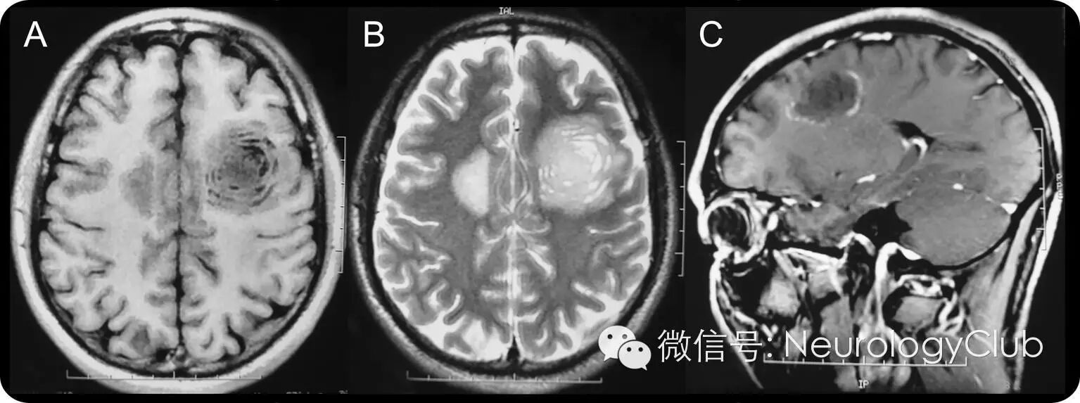 42岁男性,表现为亚急性起病的右侧轻偏瘫和轻度认知功能缺损,病前30天曾口服600mg左旋咪唑驱蛔虫。头颅MRI可见双侧额叶白质2处不规则病灶。左侧较大者为同心圆样(图A、B),注射对比剂后,呈环形强化(图C)。患者诊断为左旋咪唑诱发的脑白质病,影像学上的改变类似Baló病(同心圆硬化)。患者接受大剂量静脉激素治疗。症状在3月内改善,复查MRI提示病灶较前缩小。