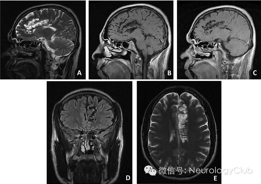 患者至当地医院行头颅MRI提示颅内多发囊性病灶,主要位于左侧额上回,扣带回及皮质下白质,胼胝体也有受累。灶周无水肿,无占位效应或中线移位。增强后病灶无强化。