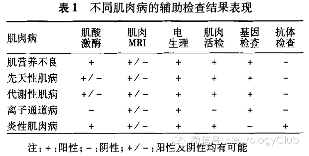 我们需要清楚把握各种辅助检查在诊断每例肌肉病患者中的顺序和利弊,不仅要观察不同患者的共性表现规律(表1),还需要注意患者的个性特点。