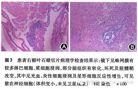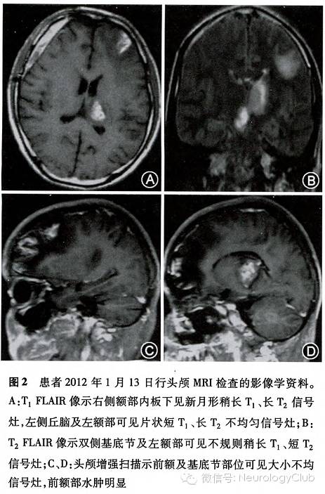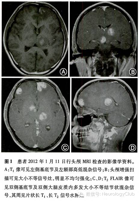 患者男性,24岁,因“急起言语不清,右侧肢体乏力5d”于2012年1月13日收入我院神经外科,于2012年2月4日转入我科。患者入院前5d在外打牌时突发言语不清,右侧肢体乏力,余无不适,未处理;3d后自觉上述症状加重,遂于当地医院查白细胞计数为11×10^9/L,中性粒细胞百分比80.8%,头颅MRI示“双侧基底节及双侧大脑半球内层区多发占位性病变,考虑转移瘤合并出血可能性大”(图1),后转入我院神经外科复查头颅MRI,示“双侧基底节及双侧大脑半球内层区多发占位性病变,病灶内合并出血”(图2),择期在全麻下行右额叶病变切除术,术后症状未见缓解,转入我科。患者发病以来无发热、头痛及意识不清等症状。既往病史(-)。入院体检:头颅右侧颞区可见3cm弧形手术伤口,言语欠清,理解力、定向力、记忆力及计算力均减退,颈稍抗,颏胸3横指,伸舌偏左,右侧肢体肌力Ⅲ级,肌张力增高,右侧膝腱反射及跟腱反射亢进,双侧踝阵挛(+),右侧巴宾斯基征及查多克征(+),余检查无异常。入院查白细胞计数为14.1×10^12/L,脑脊液压力80mmH2O(1mmH20=0.0098 kPa),脑脊液常规+生化检查+病毒全套检查[巨细胞病毒抗体(IgM、IgG)、单纯疱疹病毒I型抗体(IgM、IgG)、风疹病毒抗体(IgM、IgG)、弓形虫抗体(IgM、IgG)、柯萨奇病毒抗体(IgM、IgG)、EB病毒抗体(IgM、IgG)]无异常,病灶区病理学检查示:镜下见蛛网膜较多淋巴细胞、浆细胞浸润,部分脑组织有软化、坏死及脱髓鞘改变,其中见充血、炎性细胞浸润及星形细胞反应性增生,可见散在神经细胞(体积变小,未见卫星现象),未见肿瘤和其他特异性改变。免疫组织化学检查示:髓磷脂碱性蛋白部分(-),而该区神经纤维细丝蛋白及突触素(+),胶质纤维酸性蛋白部锁+),巢蛋白(-),神经元特异核蛋白散在少数(+),Ki-67增生的星形细胞(+),CD45RO及CD3(+),CD20灶状,CD138散在(+)。病理诊断:符合脱髓鞘性脑病(图3)。综合上述检查结果,临床诊断为AHLE。予大剂量甲泼尼龙+阿昔洛韦治疗,病情未见好转,患者家属要求出院。随访2个月后患者死亡。