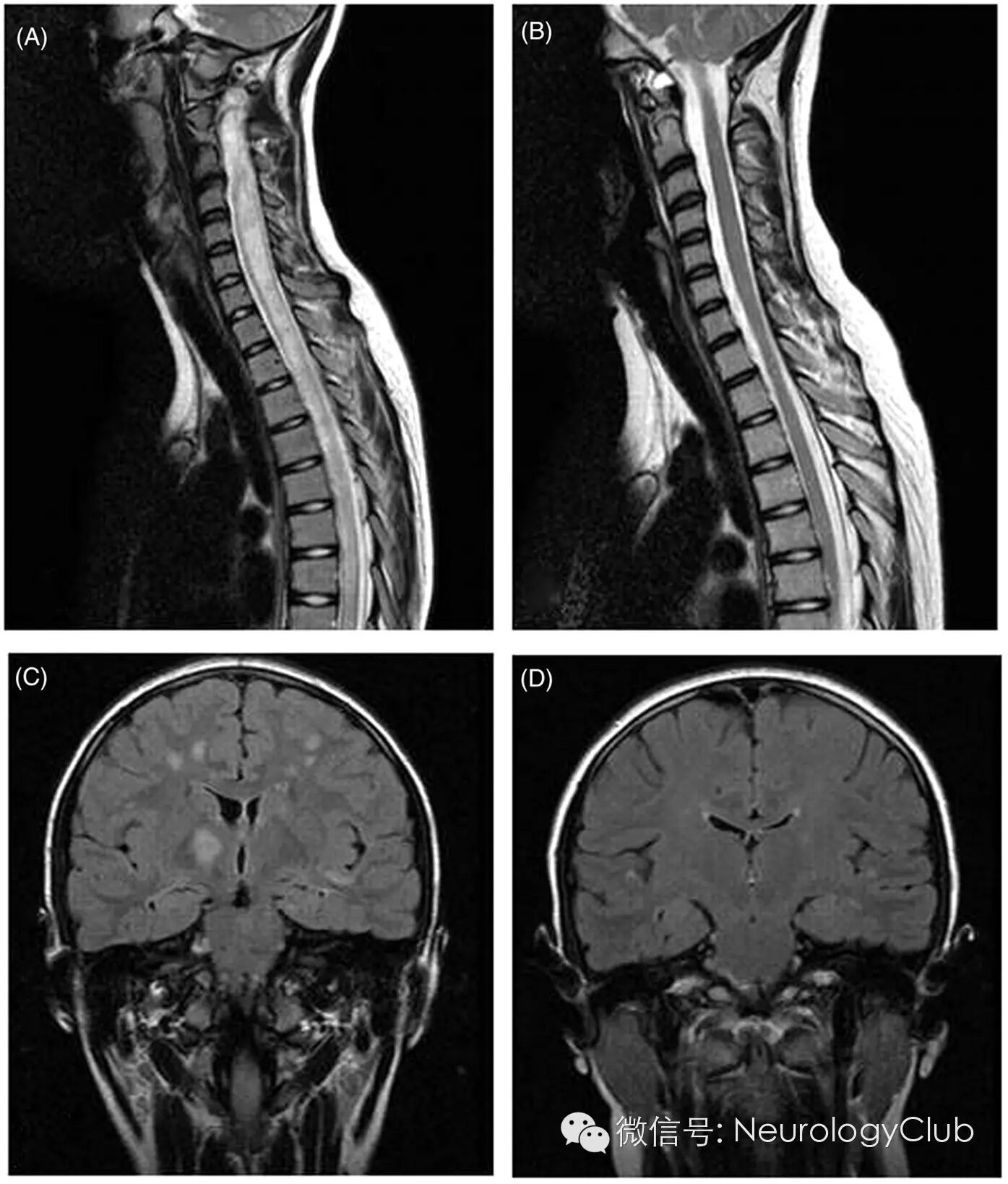 (A:矢状位T2WI提示急性期脊髓长节段T2高信号;B:3月后复查病灶明显消失;C:冠状位FLAIR提示脑室旁,皮质下白质以及基底节区多发T2高信号;D:3月后复查病灶明显消失)