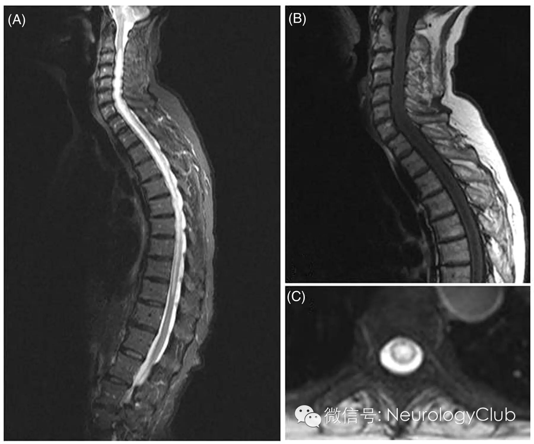 (AQP4阳性的NMO患者。A-B:C2-T10可见长节段脊髓病灶,脊髓中央水肿,呈T2WI高信号,T1WI低信号;C:横断面T2WI脊髓周围白质未受累)