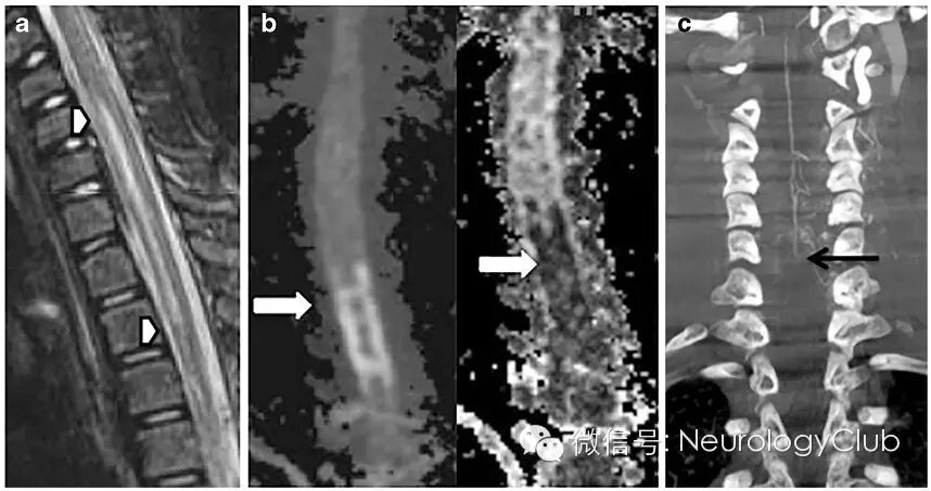 (a:脊髓长节段高信号与异常流空现象;b:脊髓血管造影提示T5-8后椎管血管性病变;c:动态CT证实硬膜内和硬膜外静脉回流)