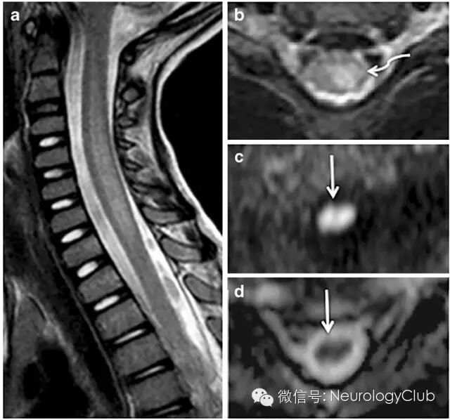 (a:长节段T2高信号长节段病灶;b:病灶位于颈髓中央和左外侧;c:DWI高信号;d:ADC低信号)