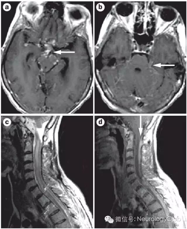 (a:颅内结节状伴脑膜强化;b:三叉神经软脑膜强化;c:C2-T1,2脊髓水肿;d:脊髓水肿伴髓外椎管背侧组织明显强化)
