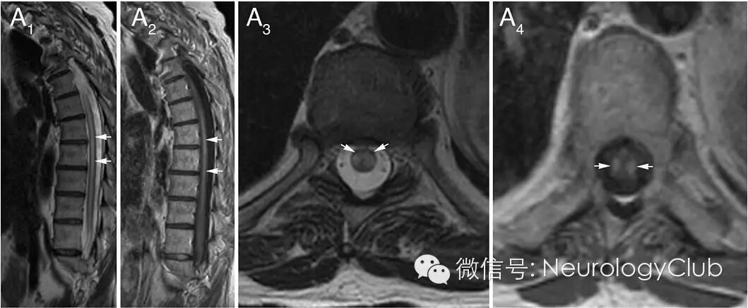 (A1:T2WI异常信号超过7个节段;A2:病灶强化;A3:横断面T2WI对称异常信号;A4:病灶强化)