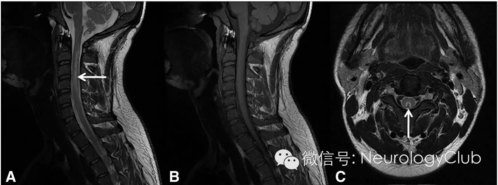 (A:C2-C5水平异常信号;B:T1-FLAIR未见明显异常;C:颈髓后索V字征)