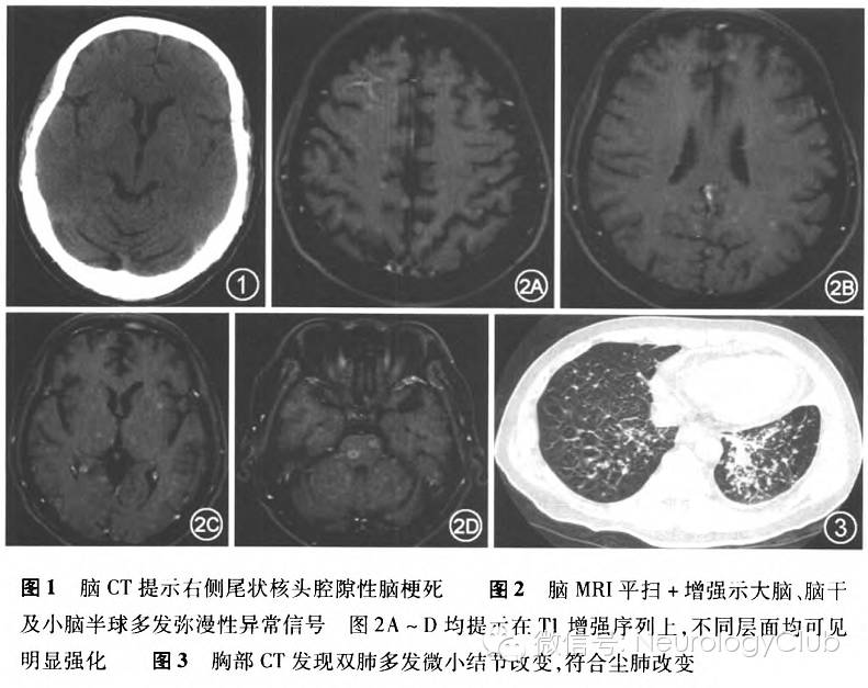 影像学检查:脑CT:右侧尾状核头腔隙性脑梗死(图1)。脑MRI平扫+增强:颅内多发弥漫性异常信号影,转移瘤可能性大(图2)。脑MRA:脑动脉硬化,多发颅内血管纤细。颈部CTA:颈动脉轻度粥样硬化,各支管腔未见有意义狭窄。胸部CT:双肺多发微小结节改变,符合尘肺改变;左肺上叶尖段后壁空洞,双肺间质纤维化;左侧胸膜肥厚;左侧胸腔积液,心包少量积液(图3)。全腹部CT平扫:左侧肾上腺结节,考虑腺瘤可能性大;轻度胆囊炎。18-氟脱氧葡萄糖正电子发射计算机断层扫描(18F-FDG PET/CT):脑内多发高密度结节,右侧顶叶脑膜弥漫性葡萄糖代谢异常增高,考虑转移瘤可能性大;左肺上野尖端含空洞组织团块,葡萄糖代谢环形异常增高,考虑瘢痕局部恶变可能性大;双肺多发小结节,葡萄糖代谢异常增高,考虑尘肺改变,部分转移不除外;双侧锁骨上、纵隔、双肺门多发肿大淋巴结,葡萄糖代谢异常增高,考虑淋巴结转移;全身骨骼多发骨质破坏并葡萄糖代谢增高灶,考虑骨转移。脑电图:大致正常脑电图。