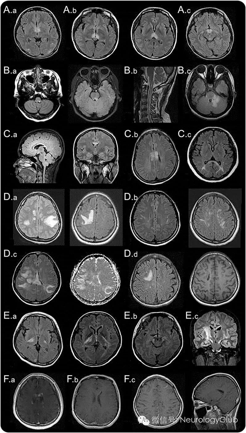 (Aa:环绕第三脑室和导水管的间脑病变;Ab:丘脑、下丘脑受累;Ac:中脑前界;Ba:邻近四脑室的脑干背侧病变;Bb:与颈髓病变相连续的延髓线状病变;Bc:肿胀弥漫的脑干背侧病变,累及小脑脚;Ca:邻近侧脑室、紧贴室管膜内层的胼胝体病变;Cb:胼胝体病变呈“大理石样图案” ;Cc:胼胝体病变呈“拱桥形图案”;Da:肿瘤样大脑半球白质病变;Db:长纺锤状病灶;Dc:ADC上病灶弥散系数增高,提示血管源性水肿;Dd:慢性期大脑半球病灶囊性变;Ea:内囊后肢皮质脊髓束病变;Eb:中脑大脑脚病变;Ec:沿锥体束的长节段病变;Fa:云雾状强化;Fb:侧脑室室管膜表面线状强化;Fc:脑膜强化)