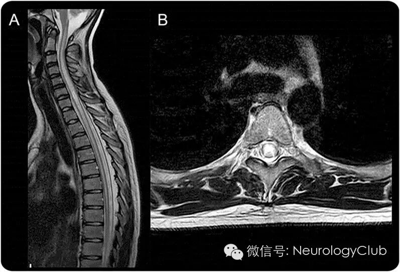 (A:累及胸髓的长节段病变;B:灰质选择性受累[H形脊髓病变])