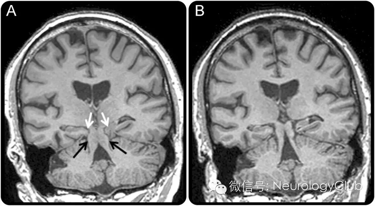(A:黑箭头示中脑下移低于小脑幕;白箭头示后海马旁回和舌回疝出;B:复查提示脑干及颞叶内侧结构复位)