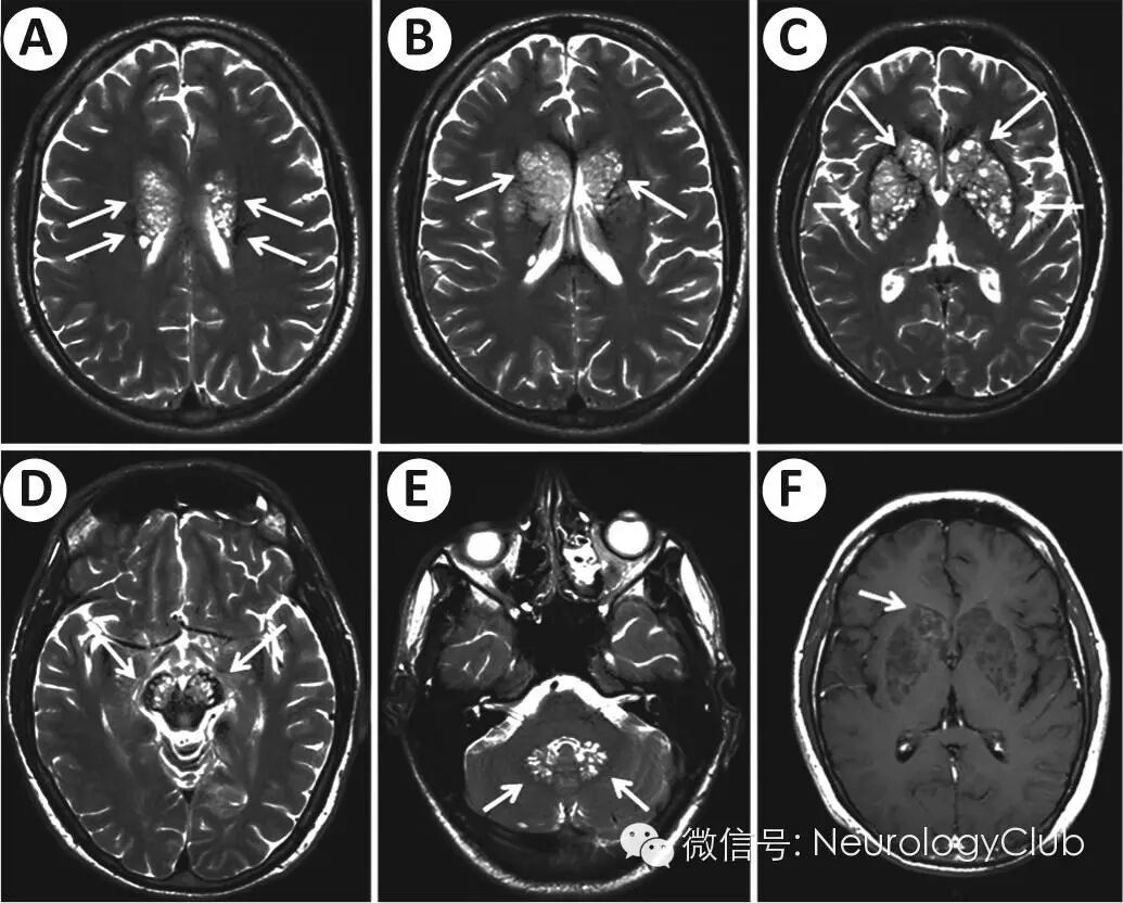 本例患者中,这些凝胶状假性囊肿在MRI上呈现肥皂泡样改变。可见多发小的圆形或卵圆形囊肿位于基底节区,丘脑,中脑,小脑和脑室旁区域。病灶于T1WI呈低至等信号(粘蛋白),T2WI高信号,FLAIR低信号。免疫功能不全患者因免疫抑制以及没有免疫活性的多糖荚膜,故假性囊肿,隐球菌瘤或脑膜强化罕见。免疫正常患者可出现局灶性神经功能缺失症状,炎症反应更明显,临床预后较好。免疫缺陷患者位于基底节和丘脑的多发假性囊肿群高度提示隐球菌感染。这些病灶反映了真菌侵袭中枢神经系统的病理机制。