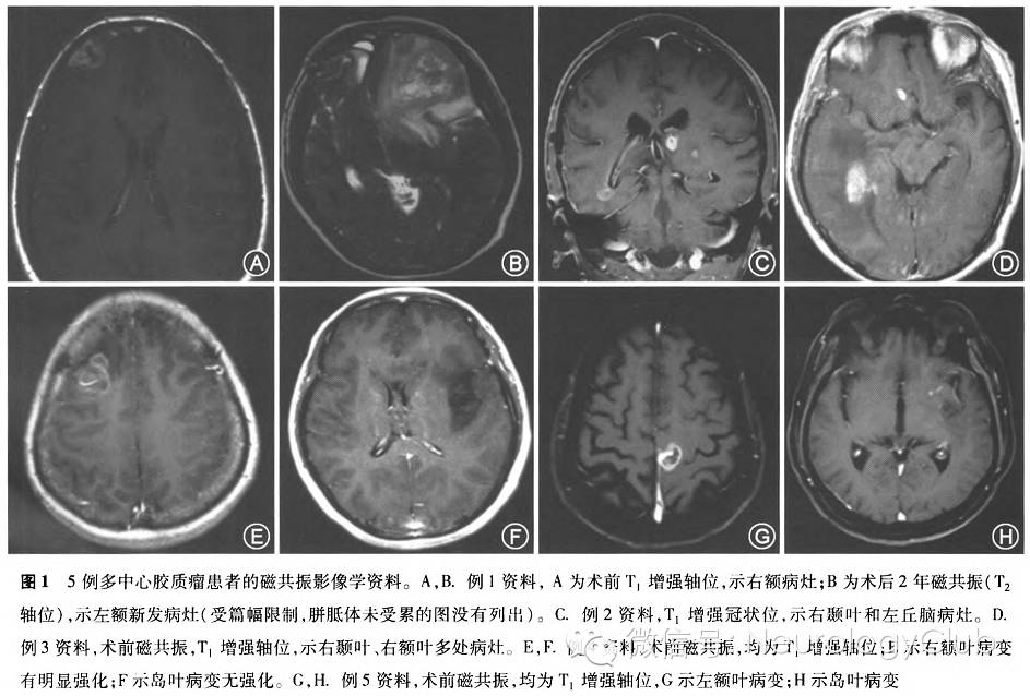 1.对象:2012年1月至2014年12月,前瞻性收集上海长征医院神经外科诊治的多中心脑胶质瘤5例。通过磁共振MRI扫描明确病灶位置和数目,并通过T2、Flair、DTI和增强扫描明确多病灶间是否可能通过已知的途径转移。根据肿瘤位置和范围评估手术风险和价值,明确病理性质。根据患者个体化情况决定是否进行辅助性的放化疗。