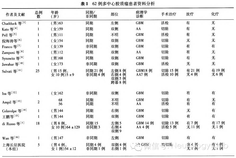 结合文献检索,共纳入多中心脑胶质瘤62例(含上述5例),年龄55±14(11-78)岁;62例中男34例,女26例,男:女为1.31;62例中同期多中心胶质瘤49例,非同期多中心胶质瘤13例;同侧25例(左侧15例,右侧10例),双侧27例(8例为跨幕上下);病理学:胶质母细胞瘤(可同时合并问变型星形细胞瘤)49例,间变型星形细胞瘤(可同时合并低级别胶质瘤)13例;手术切除43例,体组织检查19例;放疗43例,化疗46例(表1)。总体中位生存时间8(0.5-84)个月,其中的非同期病例如以出现新发病灶的时间作为起始点,中位生存时间为7(0-21)个月。