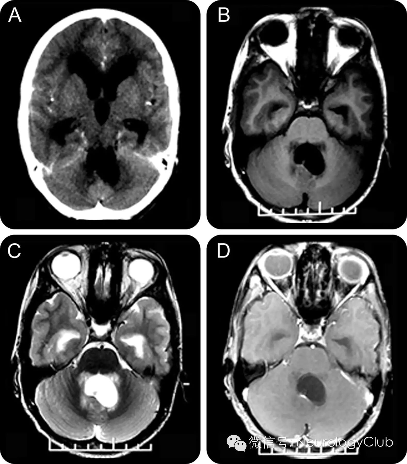(图1 四脑室扩大,扭曲变形,可见结节 A:增强CT;B:T1WI;C:T2WI;D:增强MRI)