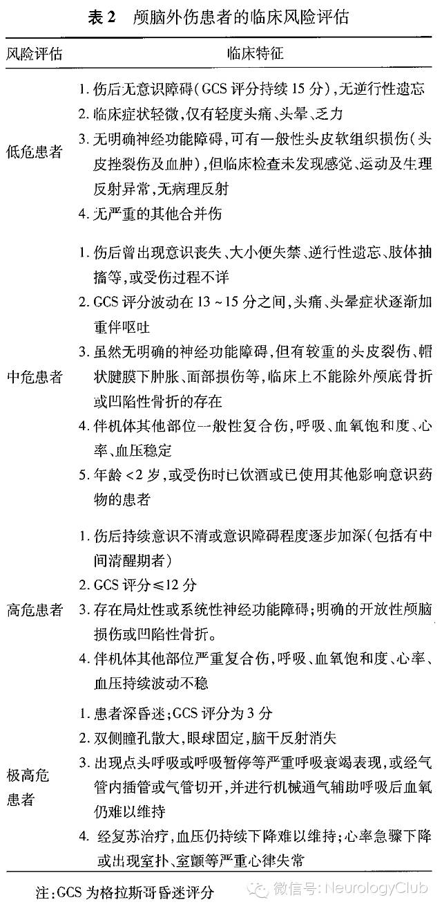 为了快速、高效地开展TBI的急诊室救治,临床医生可根据患者的临床特征进行风险评估,尤其是在群伤患者的救治时,科学分类将有助于保障患者的安全,提高救治质量(表2)。