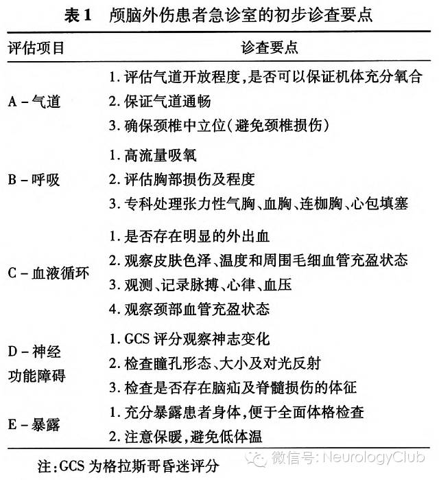 初步诊查是指在TBI患者送达急诊室后医护人员立即对伤情进行的分析判断与处置,其目的是为了快速了解伤情,及时处理致命病症,它既是急诊室诊断的开始,也是进一步救治患者的基础。为了防止疏漏,可按照英文字母“ABCDE”顺序进行(表1)。