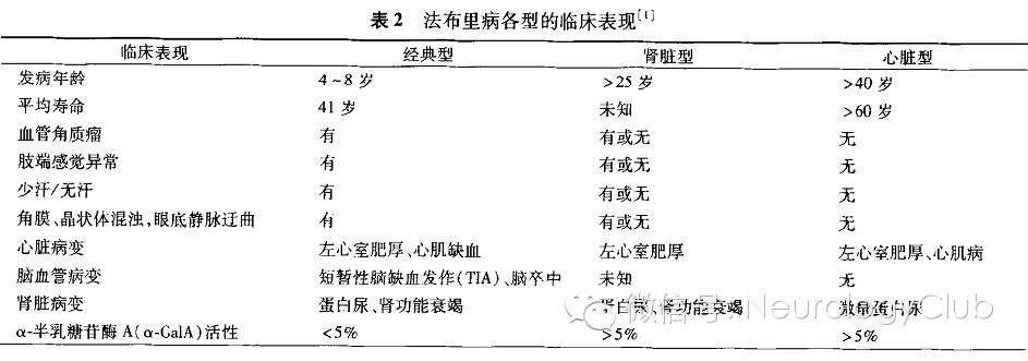 根据临床表现,通常将法布里病分为两型:(1)经典型:患者α-Gal A活性明显下降甚至完全缺失,脑、肾脏、心脏、周围神经等多系统受累;(2)迟发型(可进一步分为“肾脏型”和“心脏型”):患者酶活性部分下降,往往限于心脏或肾脏受累。绝大部分男性患者和极少部分女性患者为经典型,大部分女性患者为迟发型(表2)。