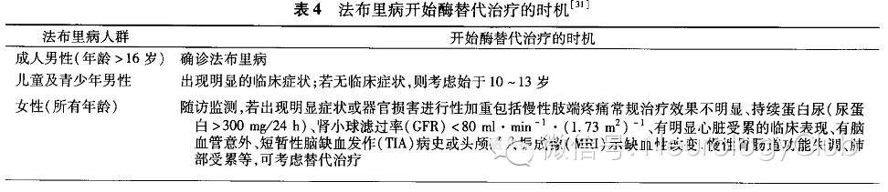 酶替代治疗主要药物不良反应有输注反应(皮疹、头痛、腹痛、发热、甚至休克等),但输注反应通过对症治疗一般能得到有效缓解。部分患者在治疗过程中出现抗α-Gal A的特异性IgG抗体。妊娠及哺乳期女性患者和合并严重并发症的患者不建议给予酶替代治疗。至今尚无临床试验探讨何时开始酶替代治疗为佳,目前建议见表4。
