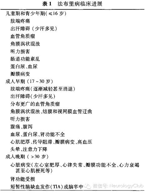 由于α-Gal A底物GL3的沉积是一个渐进的过程,因此法布里病的临床表现也随着年龄的变化而有所不同(表1)。