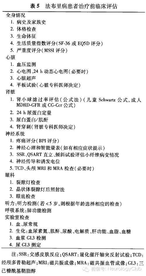 1.治疗前临床评估:由于法布里病临床表现个体问差异很大,其治疗因其临床表现的严重程度不同而异,因此一旦诊断确立,在开始治疗之前,需对患者疾病的严重程度进行全面、准确地评估,为正确治疗方案的确定、治疗反应的评估及今后进一步的研究提供可靠的依据(表5)。