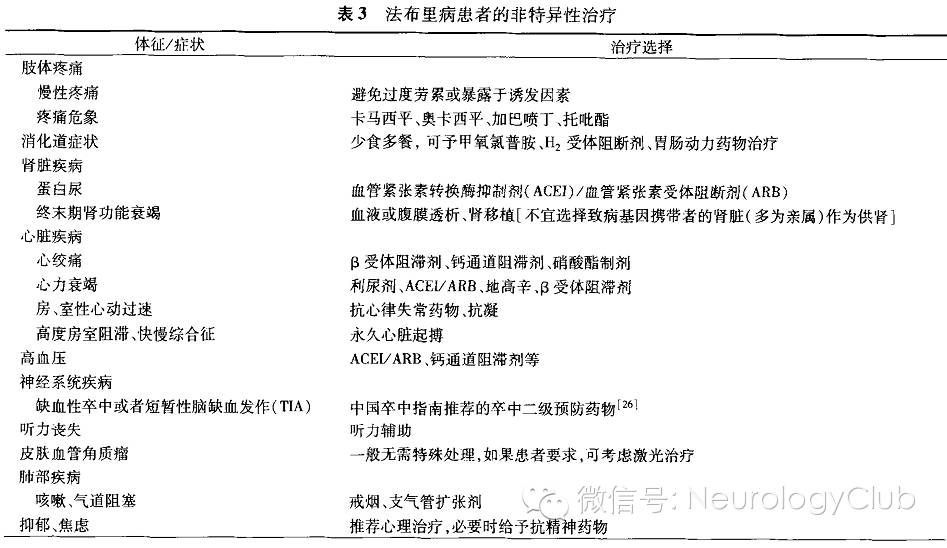 2.特异性治疗:酶替代治疗,即利用基因重组技术体外合成α-Gal A替代体内缺陷的酶治疗法布里病。多个随机对照及开放扩展临床试验结果均显示重组人类α-Gal A替代治疗法布里病可减少患者细胞内GL3的沉积,有效减轻患者的肢端疼痛、胃肠道症状,改善心肌肥厚,稳定肾功能,从而改善患者的生活质量和预后。