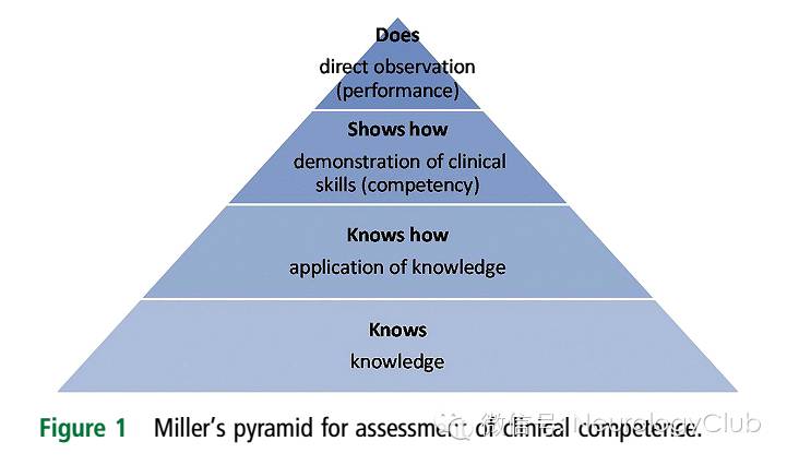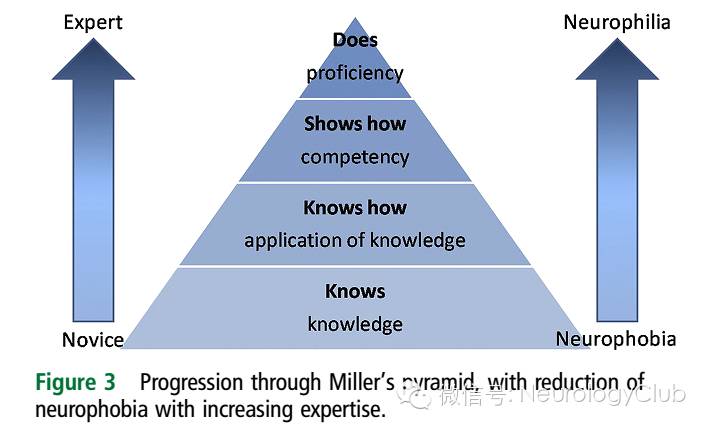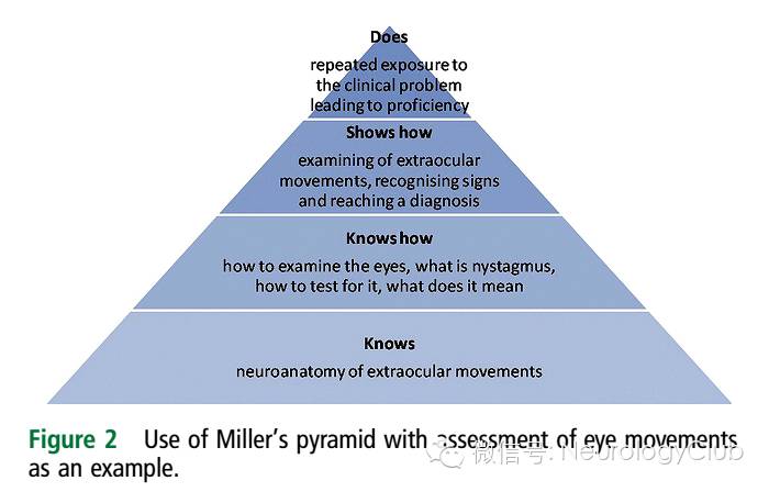 神经科医生应时刻准备好帮助医学生朝能力金字塔的顶端发展,通过在他们附属的医学院校中整合神经病学课程,保证教学的一致性,确保核心技能能被很好的传授。在研究生阶段,神经科医生可以基于Bayesian法和启发法教授更高级的神经系统检查技巧。