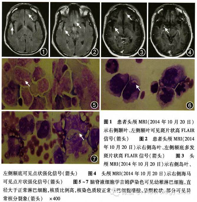 患者男性,55岁。主因“反应迟钝20余天,加重伴意识不清4d”于2014年10月17日入院。患者于20余天前无明显诱因出现反应迟钝,与人交流减少,能认识家人,生活基本自理,就诊于当地医院,行脑电图检查示全脑广泛明显异常,诊断为“病毒性脑炎”,给予抗病毒治疗(具体治疗不详)后,症状无明显缓解。于4d前腹泻1次,逐渐出现意识不清,不能认识家人,言语及进食困难。既往史、个人史及家族史无特殊。入院后体检:体温37.9℃,心率82次/min,呼吸18次/min,血压122/77mmHg(1mmHg=0.133kPa)。神经内科体检:意识模糊,体检欠合作,对光反应灵敏,脑神经体检阴性,四肢可见自主活动,四肢肌张力、腱反射正常,双侧巴宾斯基征未引出,脑膜刺激征阴性。入院后查血常规、生化全项、凝血常规、大小便常规未见明显异常,术前四项(乙型肝炎、丙型肝炎、梅毒螺旋体、获得性免疫缺陷综合征)、垂体激素六项、甲状腺激素、血皮质醇(晨起8:00)、血维生素(维生素B12、叶酸)、肿瘤标志物检查未见异常。头MRI+MRA(2014年10月20日)示脑内多发异常长T2高FLAIR信号,强化后部分信号可见强化(图1-4),MRA未见异常。经患者家属知情同意,行腰椎穿刺术,示颅内压110mmH2O(1mmH2O=0.0098kPa),脑脊液常规:总细胞50×10^6/L,白细胞2×10^6/L,脑脊液生化:氯化物125mmol/L(正常值118-132mmol/L)。葡萄糖1.4mmol/L(正常值2.5-4.5mmol/L),白蛋白1.02g/L正常值(0.15-0.45g/L)。脑脊液细胞学:光镜下可见幼稚细胞(图5-7)。脑脊液流式细胞学示:脑脊液中发现部分大细胞,表达B淋巴细胞表型。查腹部超声未见异常,骨髓穿刺示粒系、红系细胞成熟正常,未见幼稚细胞。诊断为PCNSL(弥漫性大B细胞淋巴瘤可能性大)。
