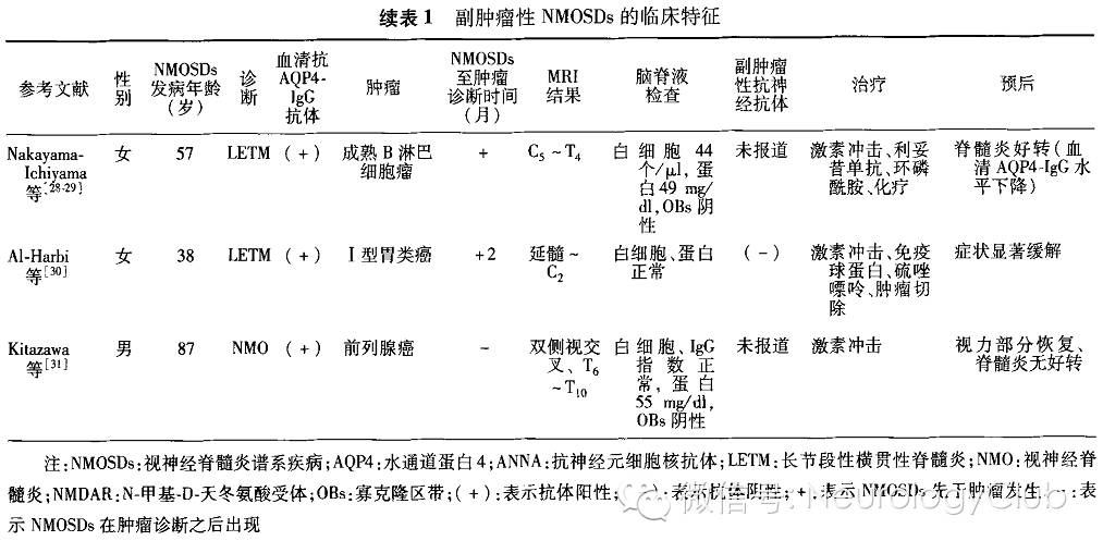 2004年Lennon等在一部分副肿瘤性亚急性多灶性神经病疑似患者的血清中检测到抗AQP4-IgG抗体。同年,Antoine等报道了1例重症肌无力合并胸腺瘤的患者在胸腺瘤切除后,疾病演变为NMO,并在该患者的血清中检测到同时针对中枢神经组织和胸腺上皮细胞的自身抗体,提示NMO的发病与胸腺瘤有关。2008年Muelter等描述了1例合并LETM的乳腺癌患者,其血清抗AQP4-IgG抗体阳性,提示乳腺癌相关的LETM可能与抗AQP4-IgG抗体有关。