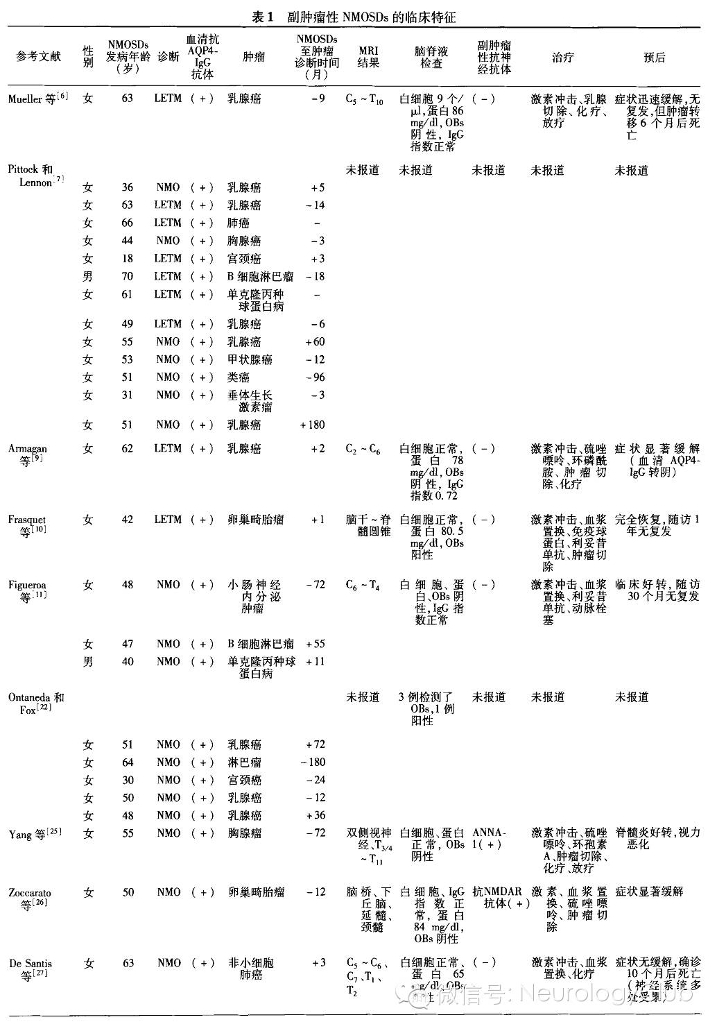 NMO患者发病时的平均年龄约39岁,但副肿瘤性NMOSDs患者的平均年龄较大。Pittock和Lennon报道的平均年龄约50岁,Ontaneda和Fox报道的平均年龄为49岁。回顾分析所有相关文献,副肿瘤性NMOSDs发病的中位数年龄为51岁(18-87岁)。在NMOSDs患者中,Pittock和Lennon报道的肿瘤患者比例约5%,而Ontaneda和Fox报道的比例约15%。在MS患者中,Mame等报道的合并肿瘤的患者比例为2.9%,平均年龄47.4岁,Stich等报道的该比例为0.8%,均低于副肿瘤性NMOSDs患者合并肿瘤的比例。在所报道的30例副肿瘤性NMOSDs患者中,27例(90%)为女性,男女比例为1:9。其中,乳腺癌(10例,33%)为最常见,其他肿瘤包括:肺癌(2例,7%)、胸腺瘤(1例,3%)、胸腺癌(1例,3%)、宫颈癌(2例,7%)、淋巴瘤(4例,13%)、类癌(2例,7%)、小肠神经内分泌肿瘤(1例,3%)、卵巢畸胎瘤(2例,7%)、垂体生长激素瘤(1例,3%)、甲状腺癌(1例,3%)、前列腺癌(1例,3%)、单克隆丙种球蛋白病(2例,7%)。在这些患者中,13例(43%)的NMOSDs症状发生于肿瘤诊断之前[中位时间8个月(1-180个月)];17例(57%)的NMOSDs症状在肿瘤诊断之后出现[中位时间13个月(3-180个月)](表1)。