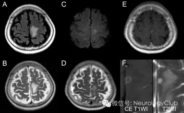 (图1:起病后3天的MRI:左侧大脑皮质FALIR[A]与T2WI[B]高信号;起病后36天,已经口服激素治疗后的MRI:[C]DWI可见左侧额叶轻度高信号病灶;[D]T2WI小病灶高信号伴周围水肿;[E]T1增强病灶呈环形强化;[F]病灶放大图)