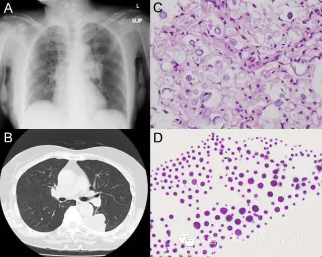 (图2:[A]胸片提示左下肺占位性病变;[B]CT显示肿块大小为4.5×3.8cm;[C]支气管镜活检组织提示微囊型新型隐球菌,HE×40;[D]脑脊液中可见酵母形态的新型隐球菌,过碘酸-希夫染色×40)