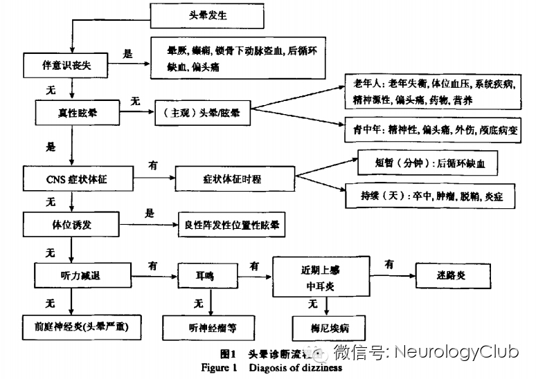临床实践中对于头晕的患者如何快速诊断是相当重要的,清楚而简捷的头晕诊断思路可以使临床医生在繁忙的日常工作中迅速对头晕的病因加以判断。笔者结合临床实际总结出从头晕症候进行分析的诊断流程图,很多临床医生使用后认为简便易行,可供借鉴与参考。此外,临床实践中应注重基本检查与细致体检相结合。如测血压,有的头昏实际上就是长期高血压所致;有时长时间看书出现头晕,实际上是青光眼的问题,只要通过阅读诱发出眼压迅速升高就不难进行初步判断。
