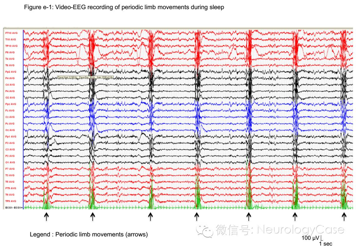 (图:视频脑电图记录的睡眠期周期性肢体运动[箭头])