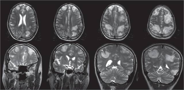(横断面及冠状位头颅MRI,T2WI,提示双侧弥漫的皮质及皮质下水肿)