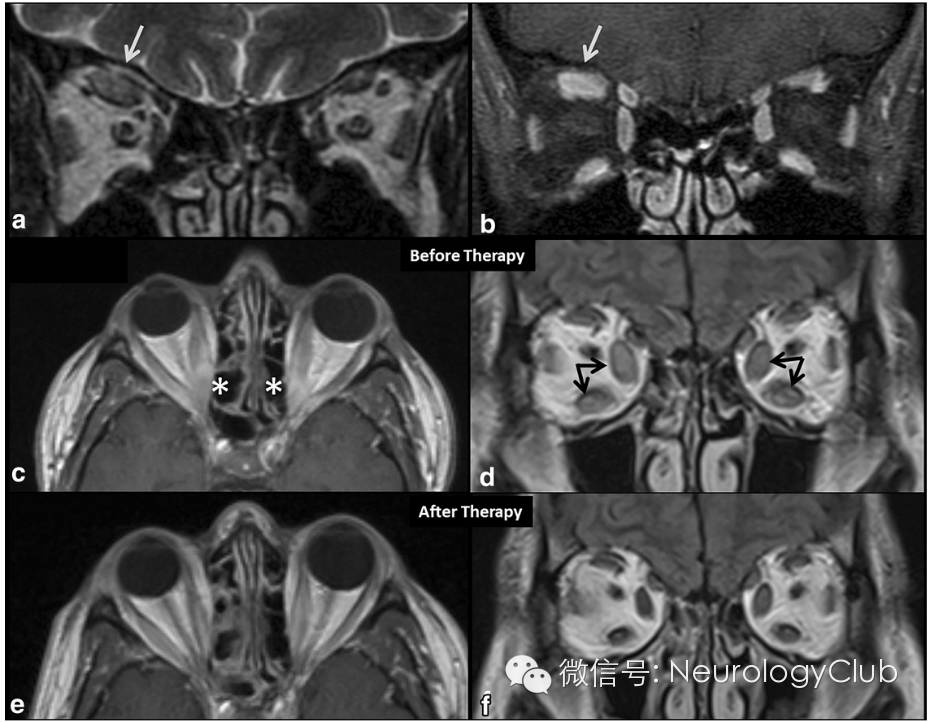 (a-b:局部眼外肌受累;a:右上直肌增粗,在T2WI上信号轻度增高;b:对比剂注射后可见肥大肌肉强化;c-f:多发双侧不对称眼外肌受累;c-d:内直肌和下直肌明显增粗[箭],内直肌包括肌腱附着处[*]可见T2 FLAIR高信号,右侧>左侧;e-f:激素治疗1月后明显改善,FLAIR上眼外肌直径减少,信号降低)