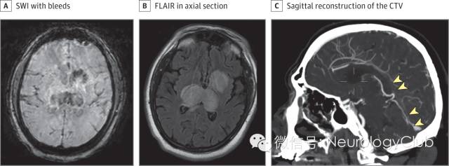 (图:硬脑膜的直窦血栓形成和双侧大脑半球深部梗死。A:磁敏感加权成像[SWI]提示双侧丘脑及左侧基底节区出血;B:FLAIR双侧丘脑,基底节区和内囊,以及胼胝体压部高信号,水肿明显;C:CT静脉造影重建可见直窦,Galen静脉和下矢状窦远端充盈缺损[箭头])
