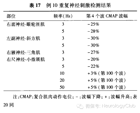 2. 常见结果:低频刺激出现CMAP波幅递减,高频刺激也可出现或不出现递减。面神经异常率最高。阴性结果不排除临床诊断。