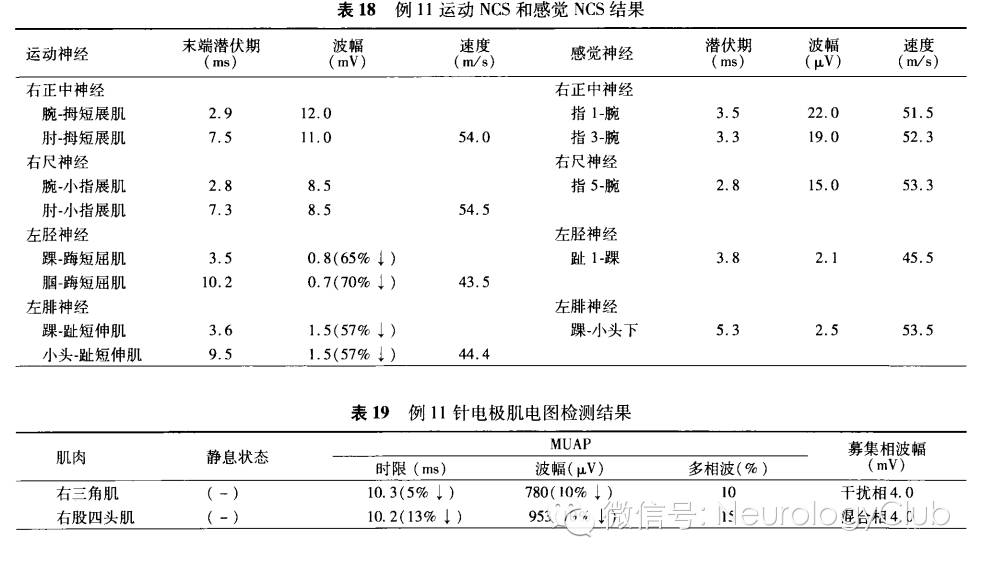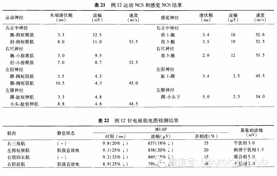 1. NCS:(1)神经选择:上肢周围神经如正中神经、尺神经或桡神经,下肢周围神经如胫神经、腓总神经及腓肠神经等。(2)常见结果:多表现为远端轴索型周围神经病,MCV和(或)SCV轻度减慢或正常,而CMAP和(或)SNAP波幅降低。也可见到MCV和SCV减慢,CMAP和SNAP波幅轻度下降或正常的脱髓鞘型周围神经病。