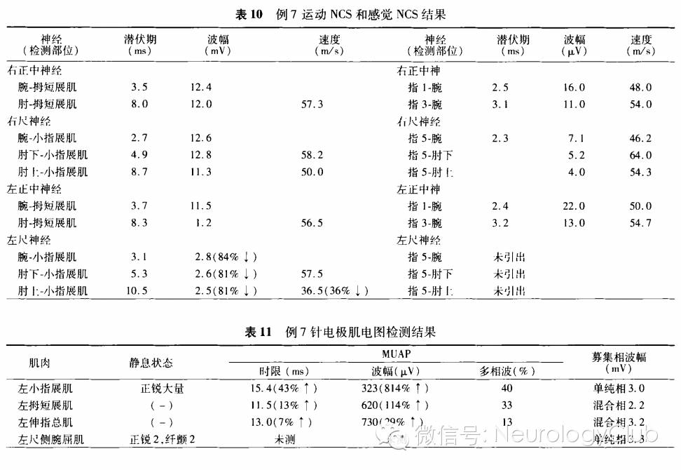 1. NCS:(1)神经选择:上肢常规测定的神经;(2)结果:MCV正常或在严重损伤时出现CMAP波幅降低,MCV轻度减慢。感觉神经传导正常。