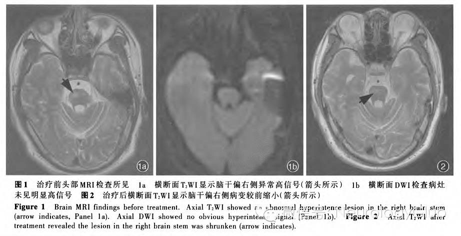 治疗方案为予以甲泼尼龙80mg/d、环磷酰胺0.20g(隔日1次)静脉滴注,连续治疗2周后改为甲泼尼龙48mg/d口服并规律减量;治疗期间复查实验室指标血清丙氨酸转氨酶水平显著升高(200U/L),考虑与环磷酰胺有关,改为硫唑嘌呤50mg/d口服和保护肝功能治疗[多烯磷脂酰胆碱胶囊456mg(3次/d)口服]。住院期间,间断鞘内注射甲氨蝶呤10mg和地塞米松10mg,并多次复查乙型肝炎病毒DNA<10^3拷贝/ml,暂未行抗病毒治疗。连续治疗15d后,临床症状明显好转,左上肢肌力恢复至5级、左下肢5级,再次行头部MRI检查,脑干和丘脑病灶较前缩小(图2),遂出院。