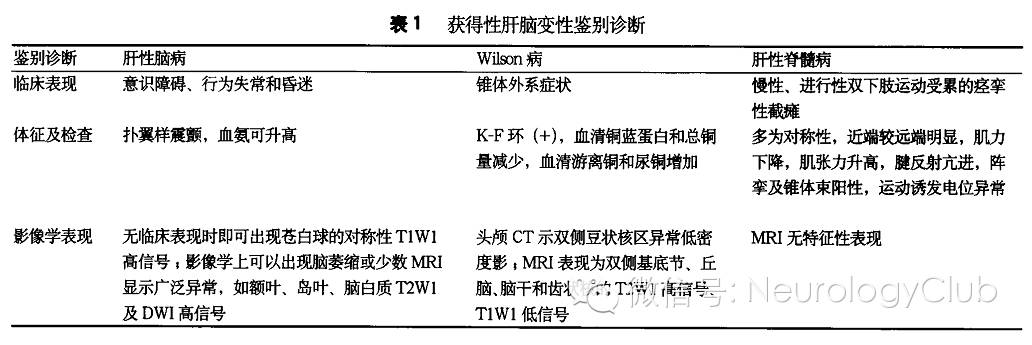 与肝性脑病(hepatic encephalopathy,HE)的鉴别:肝性脑病是指发生于肝脏功能严重障碍或失调且排除其他已知脑病的神经心理异常综合征,其主要临床表现是意识障碍、行为失常和昏迷,是急性肝衰竭及慢性终末期肝病相关的常见并发症,脑部的病理改变主要是弥漫性脑水肿。AHCD主要与C型HE鉴别,C型HE以慢性反复发作的性格、行为改变、甚至木僵、昏迷为特征,常伴有肌张力增高、腱反射亢进、扑翼征、踝阵挛阳性,或巴宾斯基征阳性等神经系统异常,发作时可伴有血氨升高。AHCD与肝性脑病不同,它存在典型的大脑器质性改变,表现为Alzheimer II型星形胶质细胞增生和神经元的缺失。HE的MRI表现较早,在无临床表现时即可出现苍白球的对称性T1WI高信号,进一步可见白质和其他锥体外系结构信号都增强。但MRI的表现无特异性,也可见于其他脑部疾病。
